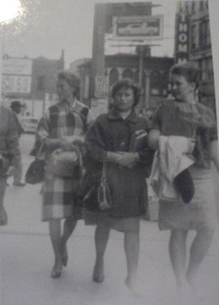 | Petra on the streets of Milwaukee in 1964 with her cousin (left) her Aunt (middle) & Petra (right) (Notice the 1964 1/2 Mustang billboard in background) |